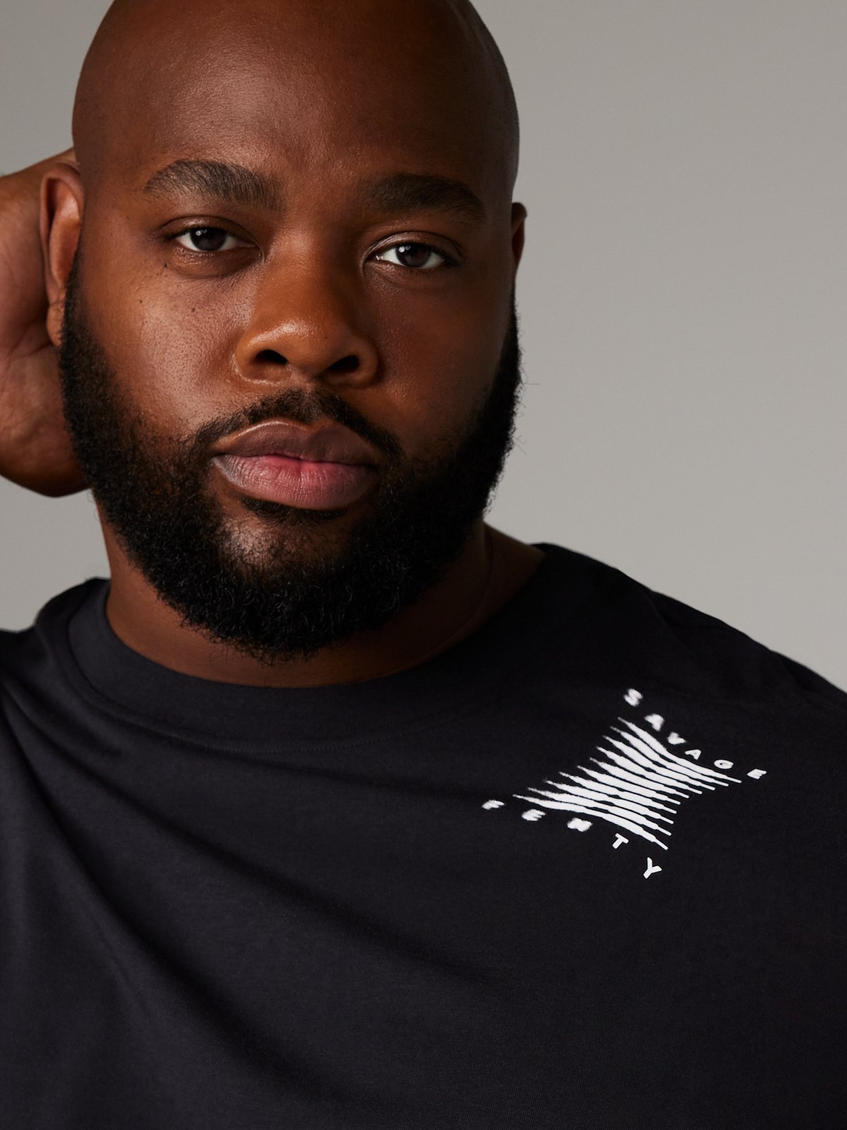- Printed logo at left neck