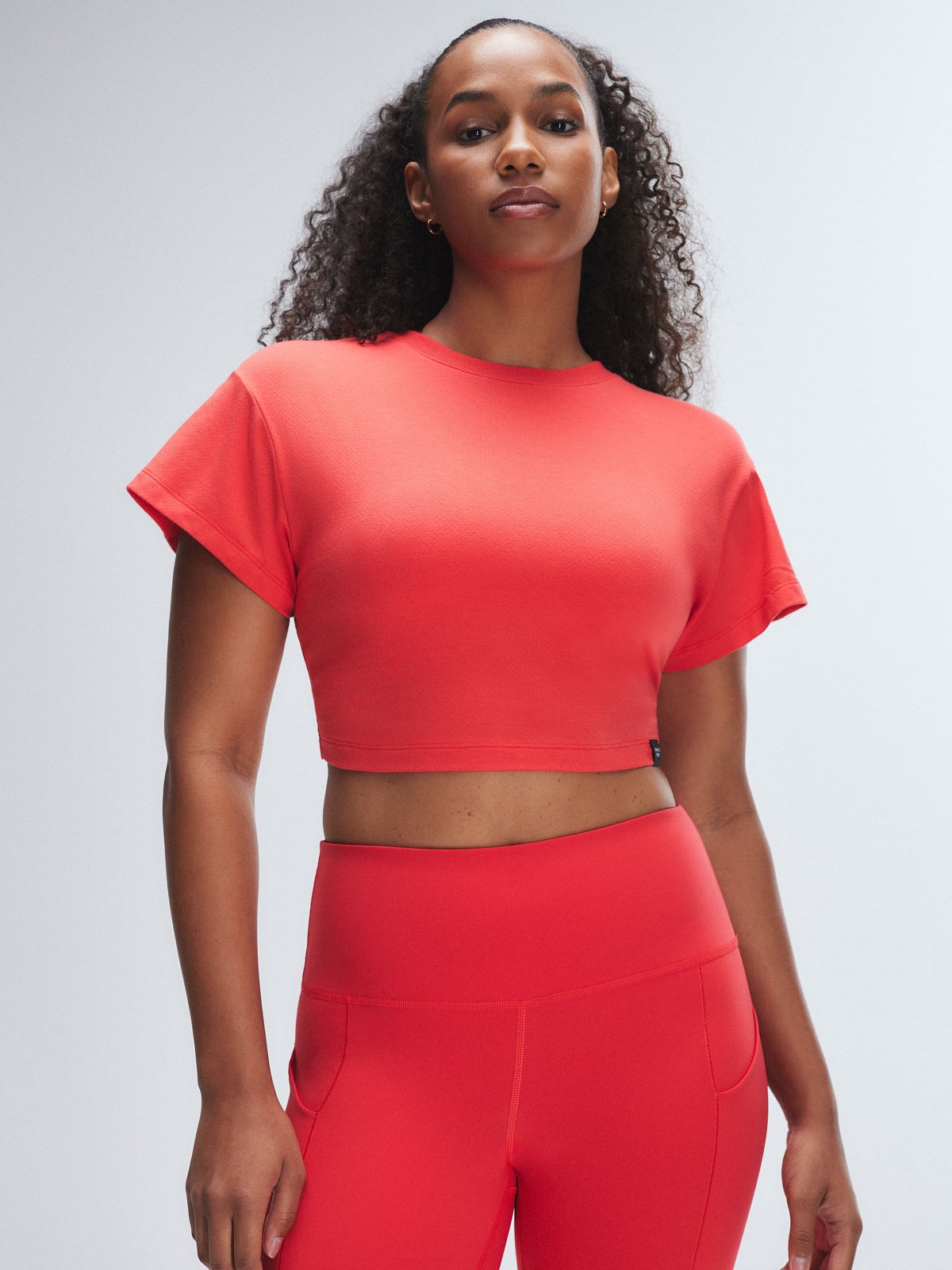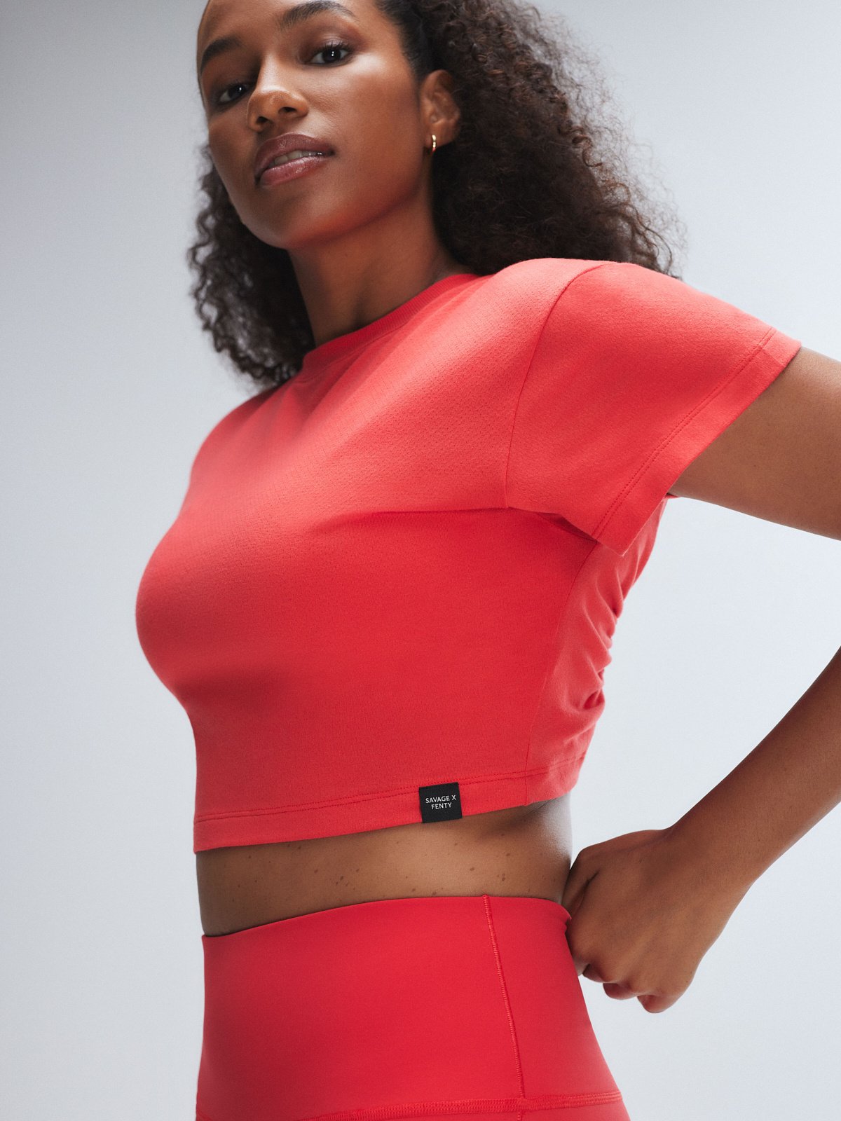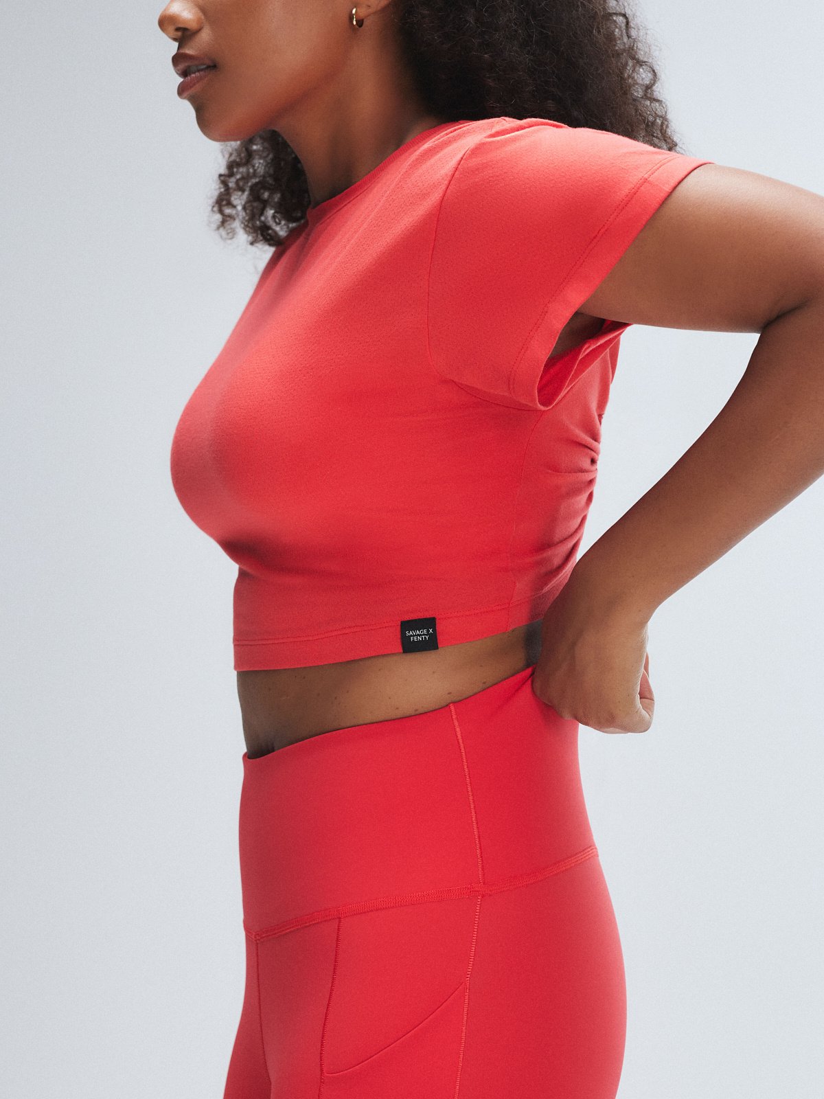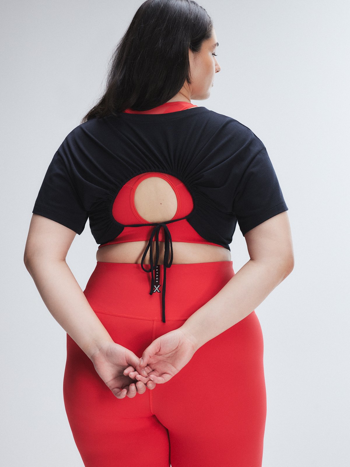 Our Flex On U Cinch-Back Crop Tee is designed with moisture wicking for comfort and made from a soft, jersey fabric. Complete with a back keyhole cutout and ribbed crew neck collar.
