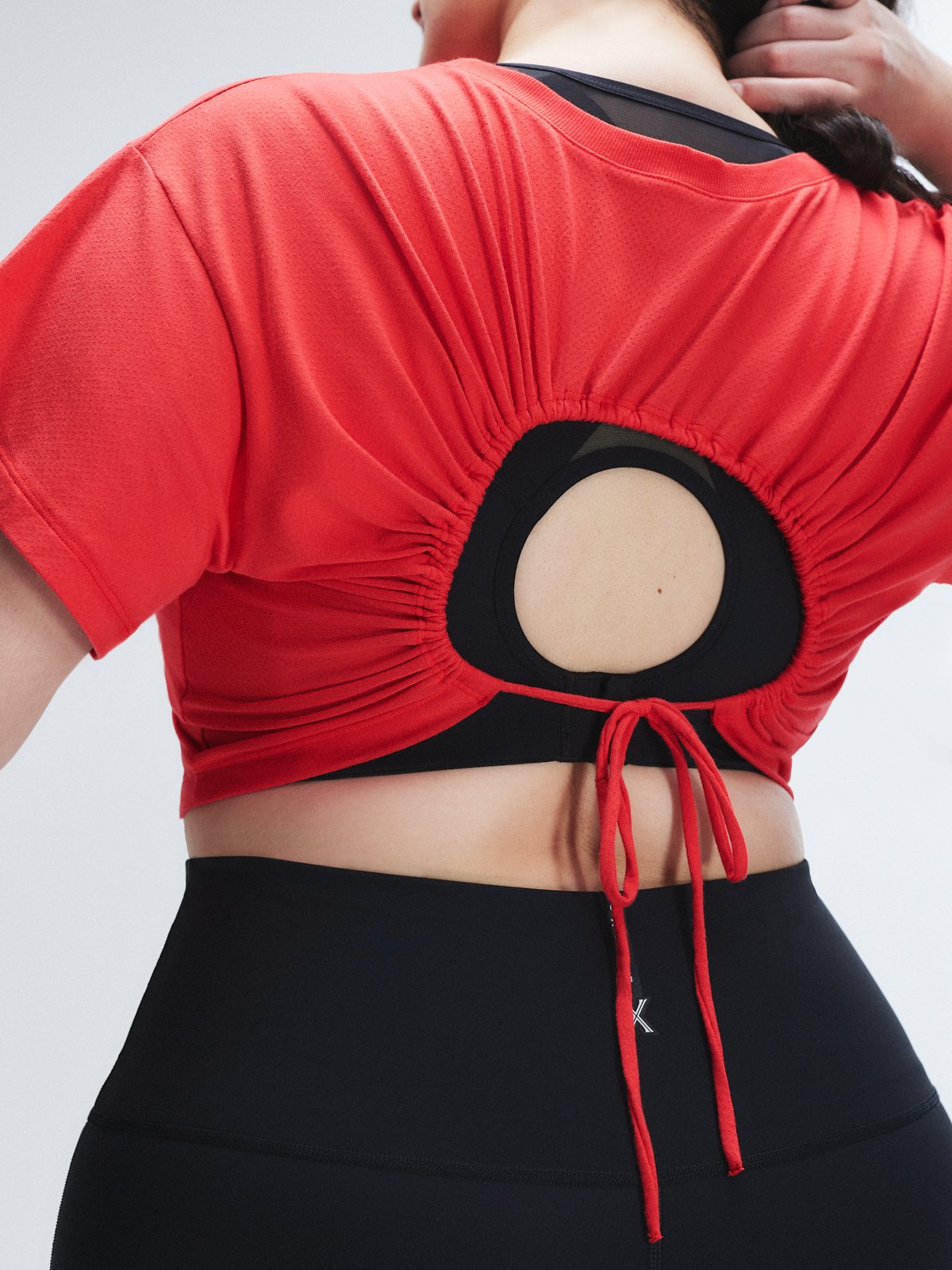 Our Flex On U Cinch-Back Crop Tee is designed with moisture wicking for comfort and made from a soft, jersey fabric. Complete with a back keyhole cutout and ribbed crew neck collar.