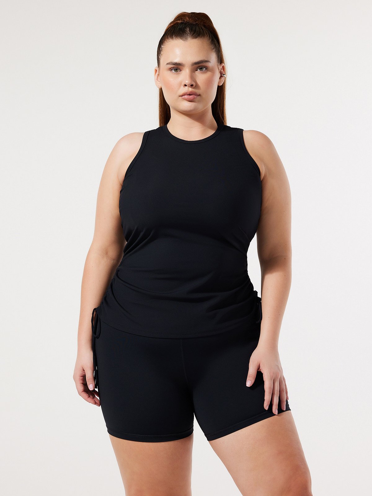 • Side ruching with adjustable drawstring