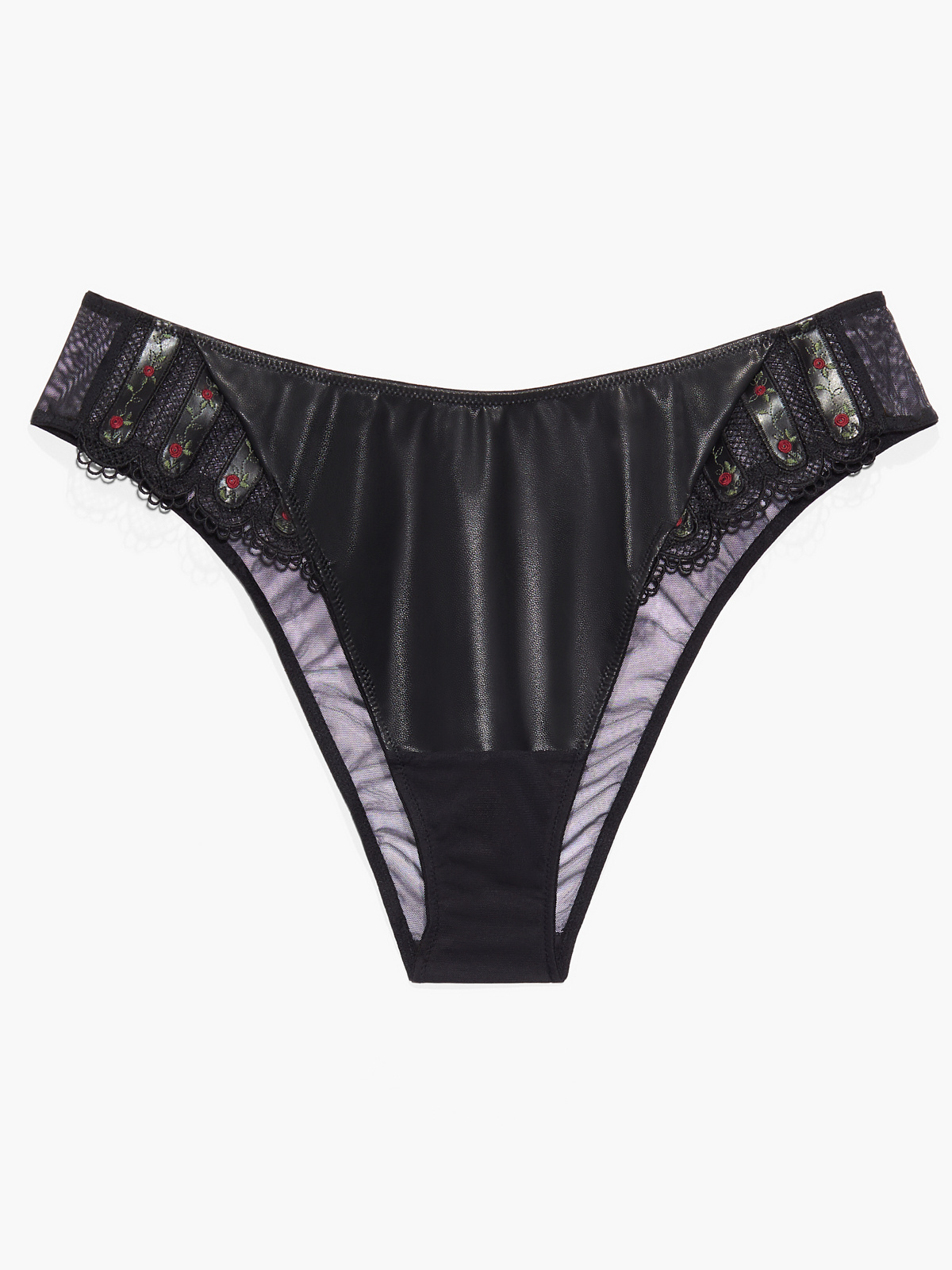 Meet your lace and leather alter-ego. Our Renaissance Rose Brazilian Panty has faux matte leather and rose embroidery, a mid-rise silhouette, and a mesh back.