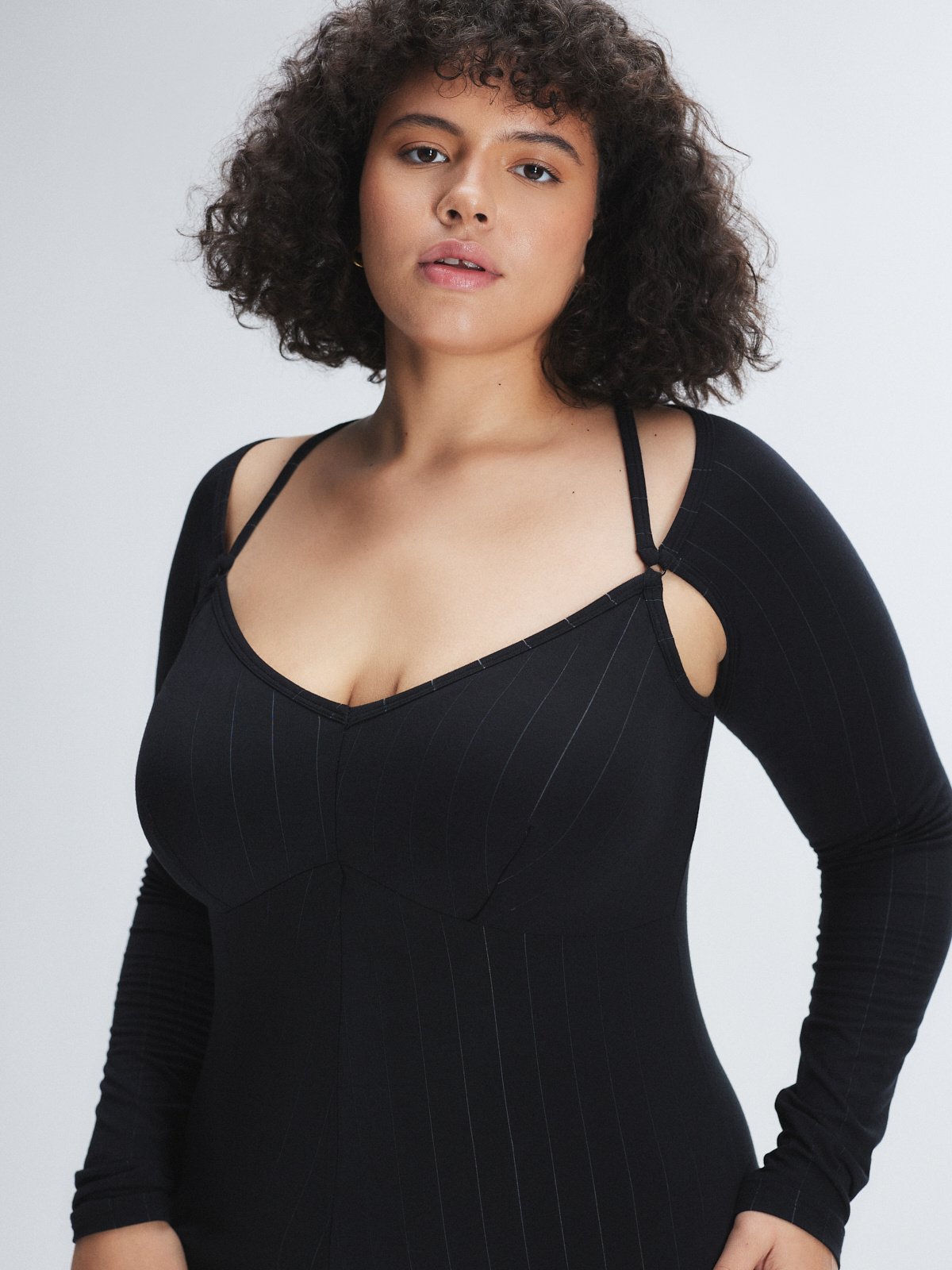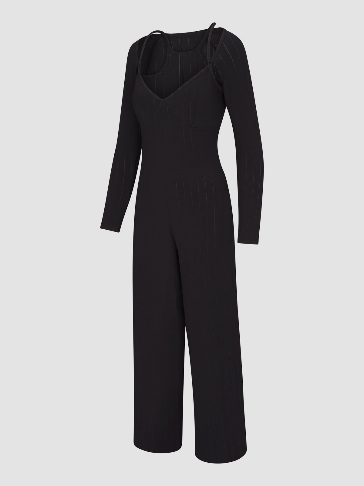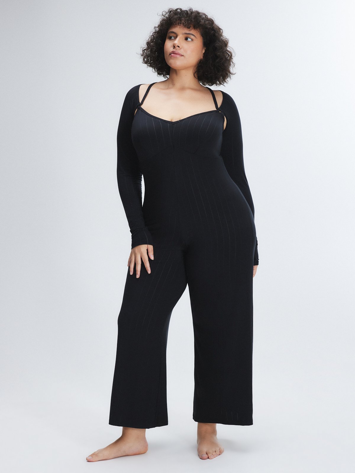 The sleekest touch. Our Sleek Stitch Jumpsuit features a flattering fitted torso with a relaxed-pant, delicate pin-striped fabric, and sexy strap details and peek-a-boo cutouts at each armhole for a cute faux shrug silhouette.