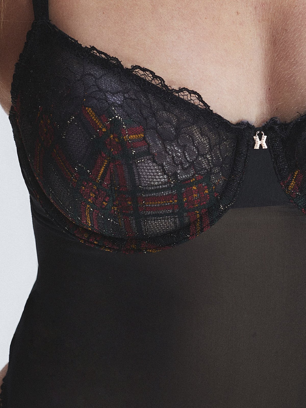 Too cool for school. Our Sparkle Prep Underwire Teddy is made from a special plaid lace with contrast floral lace overlay at the cups, and features a sheer tricot body and a peek-a-boo cutout in back.
