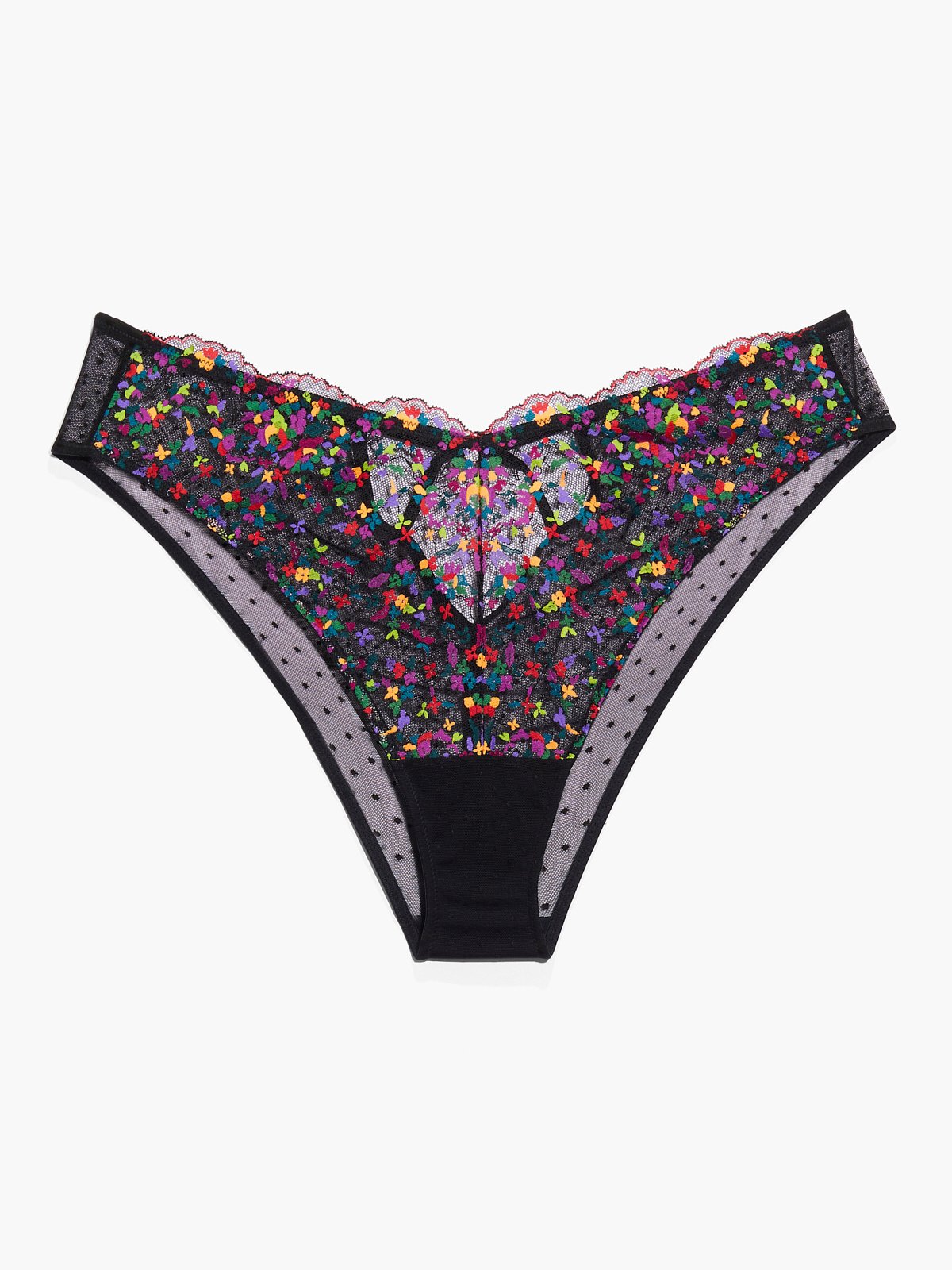 Lush flowers are always a vibe! Our sheer Steamy Floral Lace Brazilian features a stretch lace body and dotted mesh back with a strappy cutout.