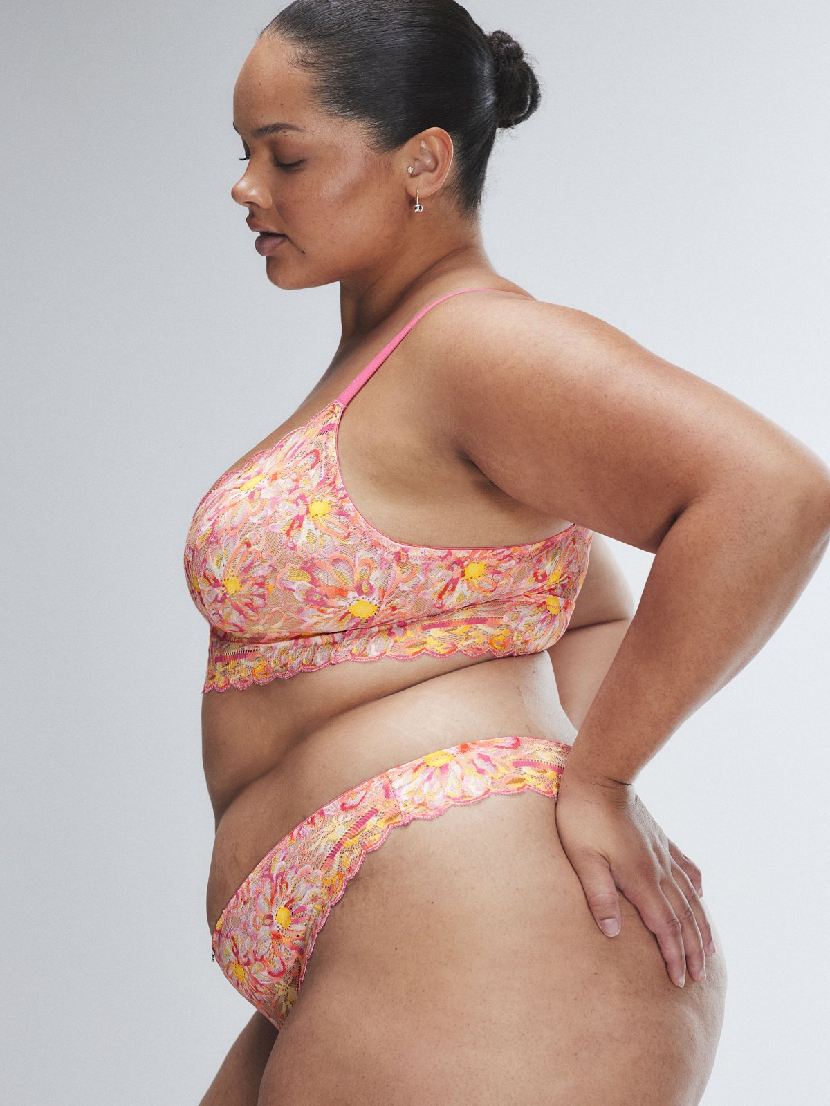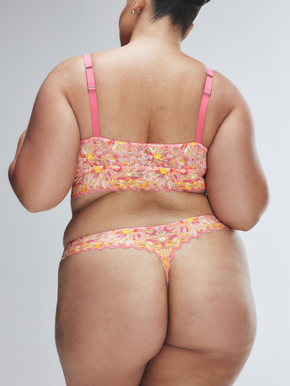 Shine bright in our Sunray Lace Thong Panty. Made from a unique lace fabric and adorned with a vibrant floral print, this thong is complete with an “X” logo charm at the waist.