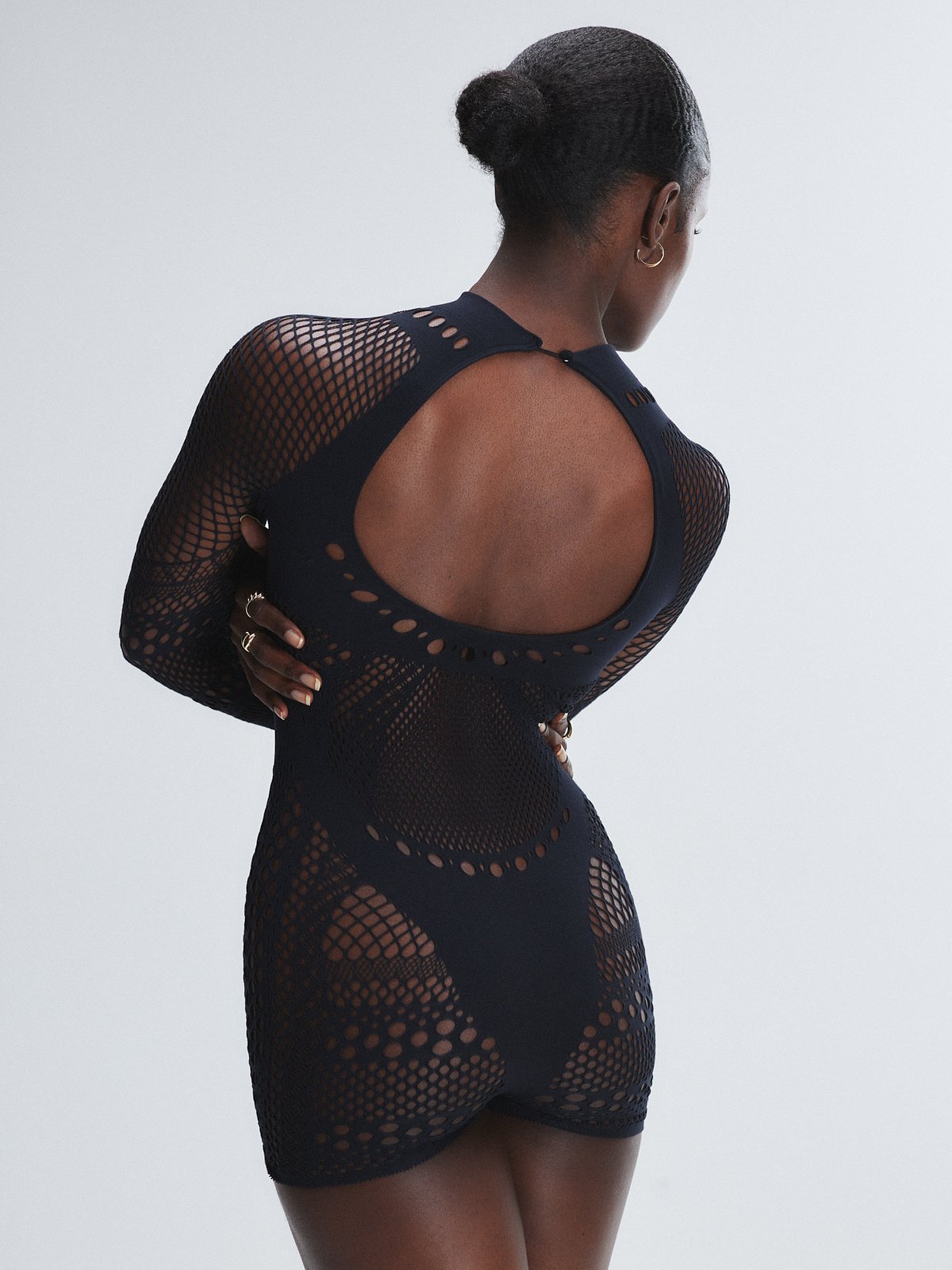 The spotlight is yours. Our Viva La Diva Seamless Romper is made from a smooth knit fabric and features a halter neckline, a cutout in back and a detailed open-knit design throughout.