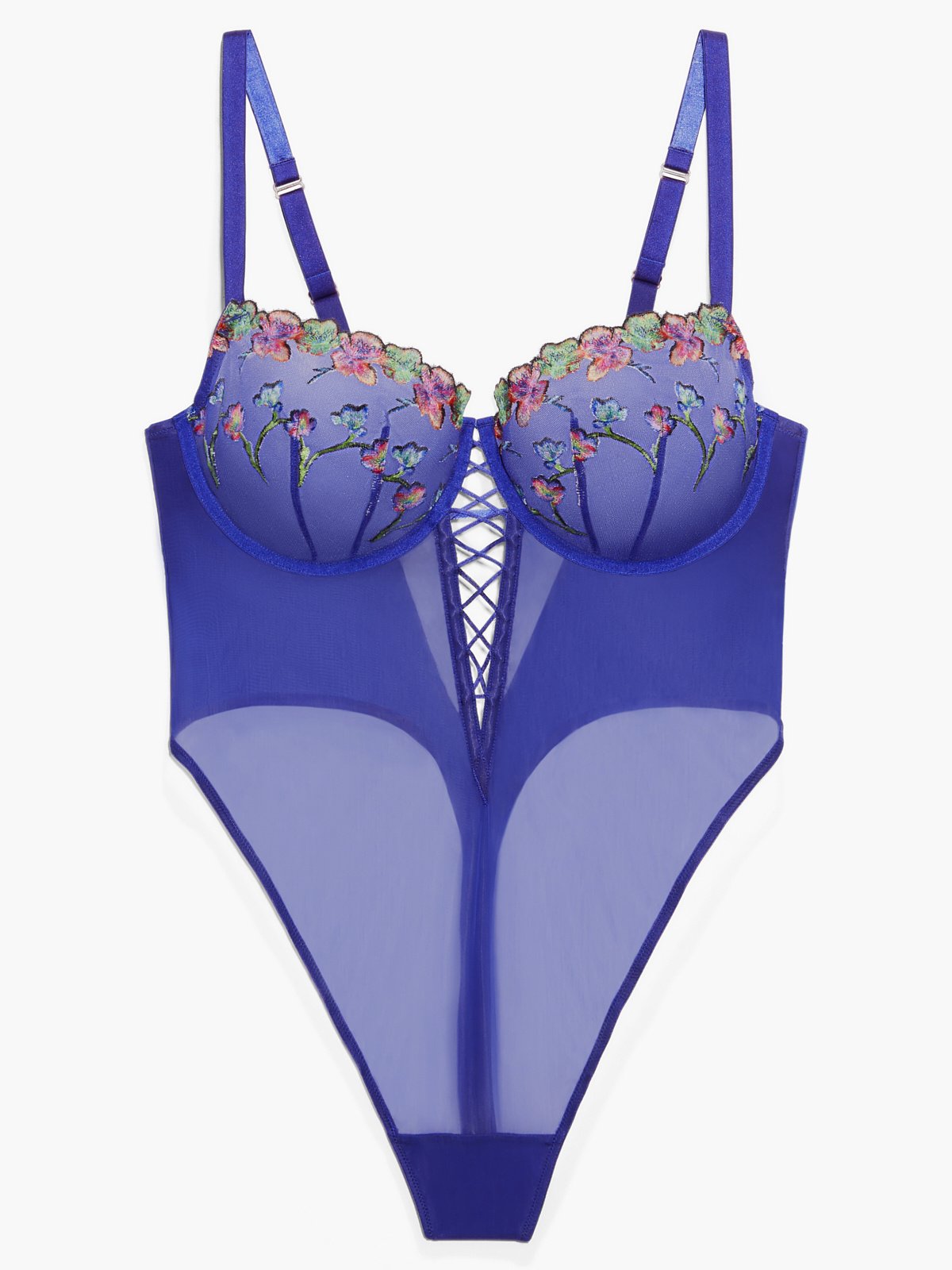 Run wild and free. Featuring orchid-print floral embroidery inspired by the Wild Wild West, our Western Wildflower Teddy has a high leg, tricot body, a lace-up cutout, and adjustable straps.